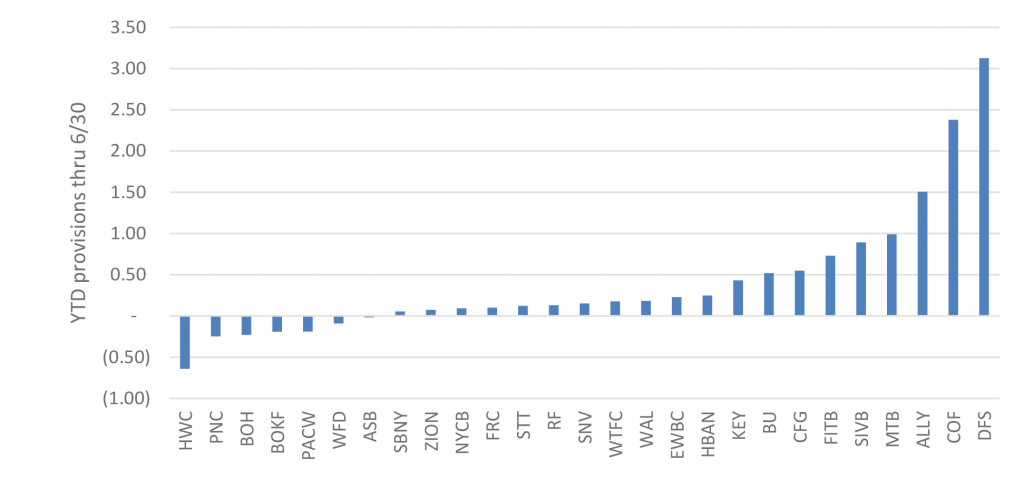 Regarding loss reserves, banks have generally been adding provisions year-to-date, partially due to strong growth in loan portfolios and partially due to heightened recession-related credit concerns (Exhibit 4, some 2Q22 numbers not yet available).
