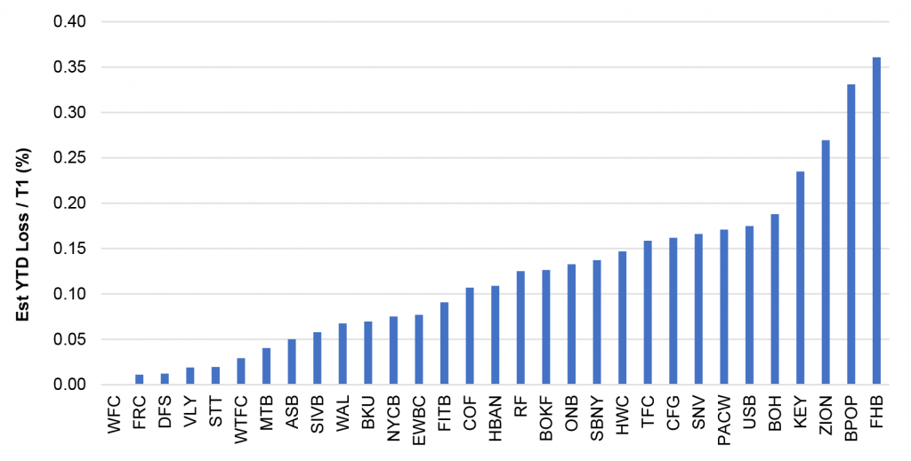 This year’s sharp rise in interest rates along with a broad spread widening for most credit asset classes has led to a significant drop in the value of banks’ loans and securities, putting pressure on capital. A sample of larger banks through June show a median estimated available-for-sale (AFS) loss of 12% as a share of Tier 1 capital (Exhibit 1). The majority of bank securities sit in the AFS portfolio, meaning the bank can sell those securities at any time if it needs liquidity.  AFS portfolios are marked-to-market with changes in value reflected in the bank’s equity position.  Tier 1 capital is primarily comprised of the bank’s common equity