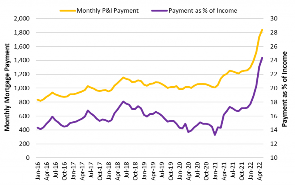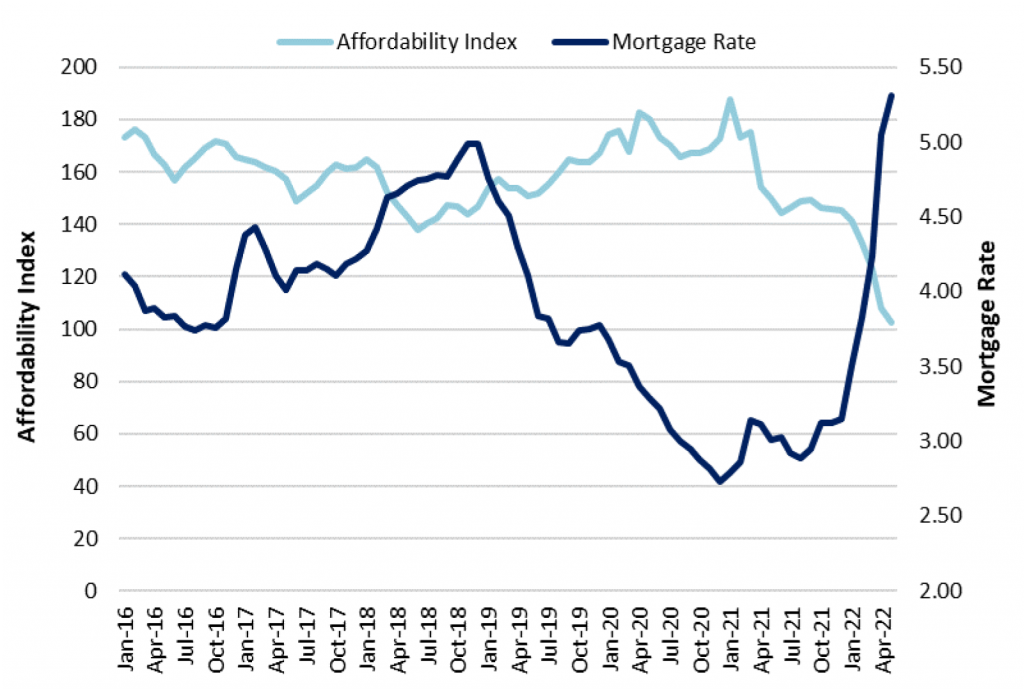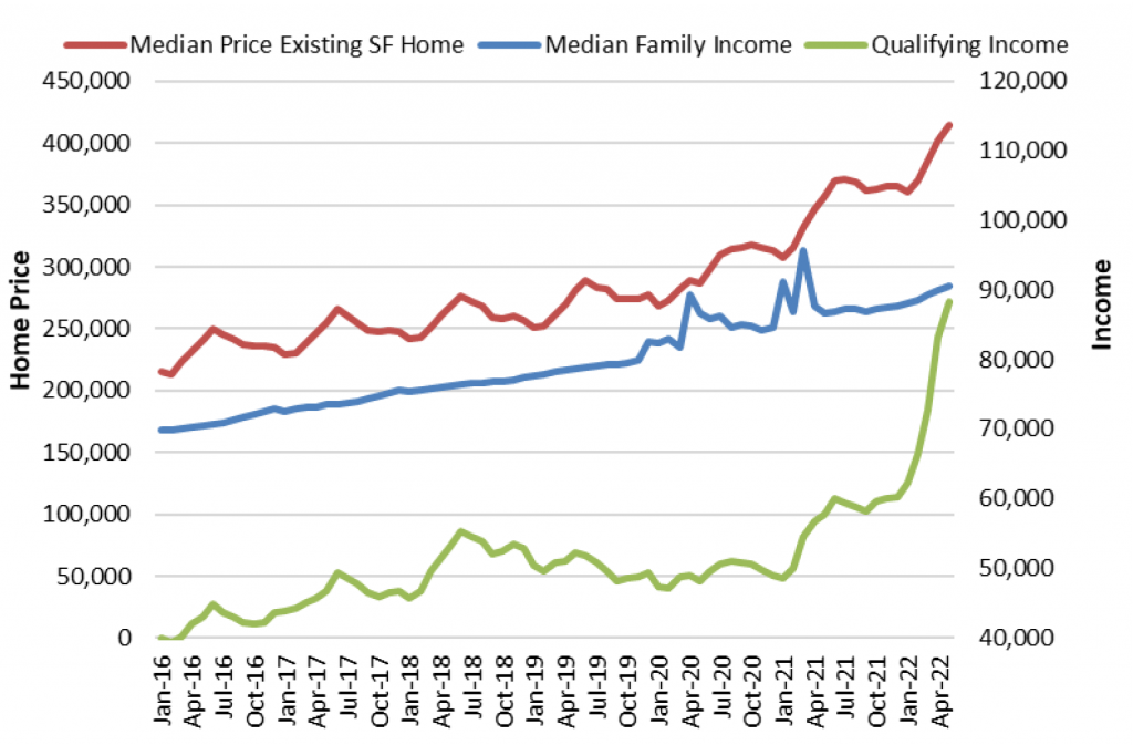 Note: Mortgage interest rates are the effective rate on loans closed on existing homes, which includes the amortization of initial fees and charges. The qualifying income is the estimated minimum income necessary to qualify for a loan on a median priced home, assuming the monthly principal and interest payment does not exceed 25% of monthly income (Qualifying Income = P & I payment * 12 * 4). Data as of May 2022.