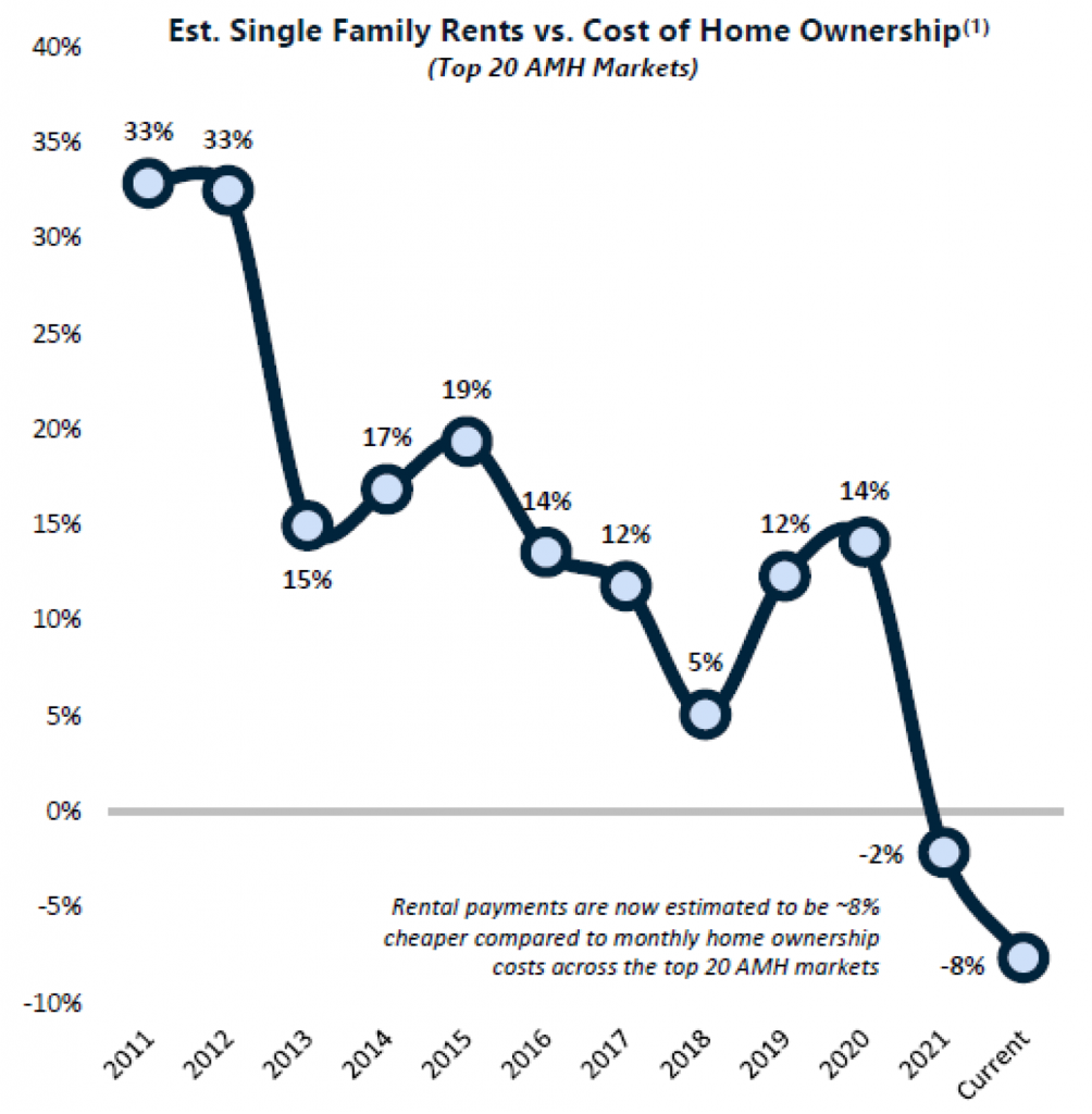 American Homes 4 Rent, the largest single-family rental (SFR) operator in the U.S., has an average rent of just over $1,850 per month, about the same as the principal and interest payment on the median priced home. Renters don’t have the additional maintenance, property taxes, mortgage insurance and other expenses that accrue to homeowners.