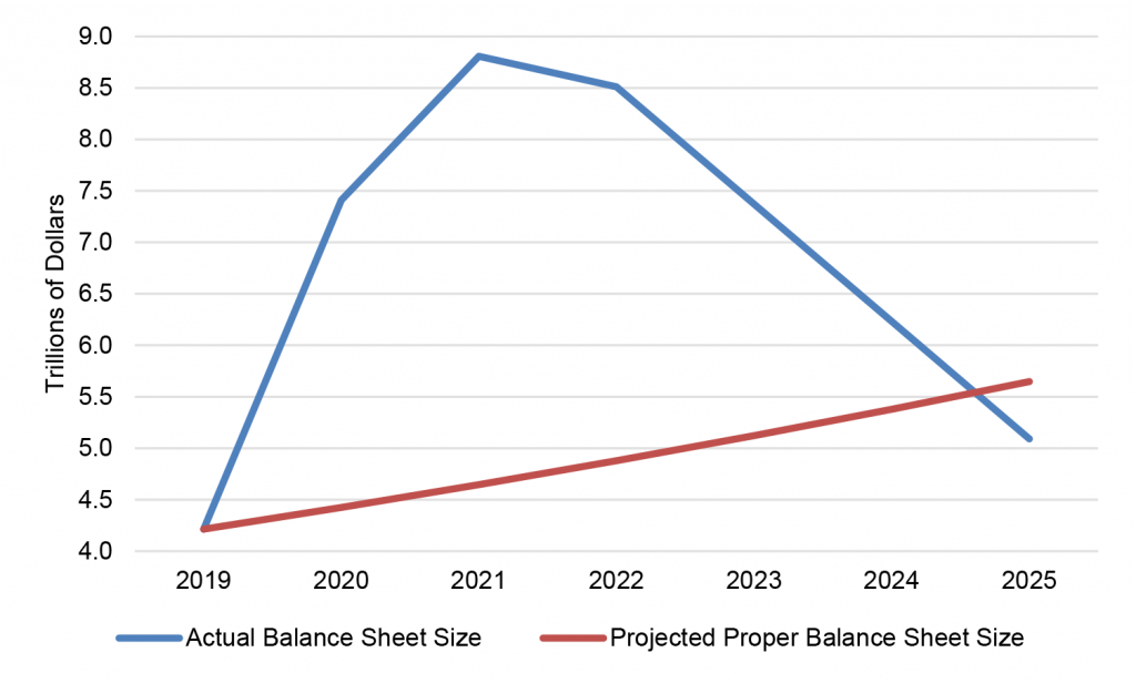 For reference, at the end of 2019, the balance sheet totaled $4.2 trillion. If we assume that this was roughly the proper level of reserves for the economy, and then assume further that reserves need to grow over time at a 5% annual pace—reflecting long-run trends for real GDP growth and 2% inflation plus a margin of about 1%—then we can draw a trend line of the projected “proper” path of the size of the Fed’s balance sheet.