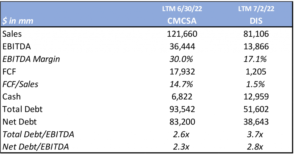 CMCSA’s financial metrics stack up very well relative to DIS, underscoring our view that the trading differential is set to collapse between the two credits. CMCSA’s EBITDA margins have long been maintained above 30%. While margins have contracted over the years given the increase in both competition as well as cord cutting, CMCSA’s annual EBITDA margin remains above 30%, with street forecasts looking for it to increase nearly 200 bp by 2025. This compares very favorably to DIS’ annual EBITDA margin which stood at 16.4% on a LTM basis. DIS’ margin was 30% as recently as 2018 but contracted significantly during the pandemic. Consensus estimates have DIS’ EBITDA margin growing by fiscal year end 2025, but its margin is still expected to be at least ten percentage points lower than that of CMCSA. Additionally, CMCSA’s free cash flow generation has been robust as the company ended the most recent quarter with a FCF/sales ratio 14.7% on a LTM basis, versus 1.5% at DIS. CMCSA’s free cash flow generation is a huge separating factor when comparing it to DIS.