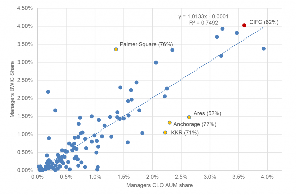 There is plenty of dispersion in the numbers, of course. Some managers, such as Palmer Square, have seen their debt show up on BWICs much more frequently than AUM alone might predict. Palmer Square has roughly a 1.40% share of AUM but nearly a 3.40% share of BWIC volume. When Palmer Square debt has come to market this year on BWIC lists, 76% has ultimately traded. Other managers, such as KKR, have shown up on BWIC less frequently than AUM might predict. KKR has roughly 2.25% of AUM but only around 1.00% of BWIC volume. For KKR, 71% of BWIC offers have traded. Based on this 2022 snapshot alone, it is hard to draw strong conclusions about any particular manager. Over another period, some managers may show more trading that AUM would predict and some managers may show less. Time will tell.