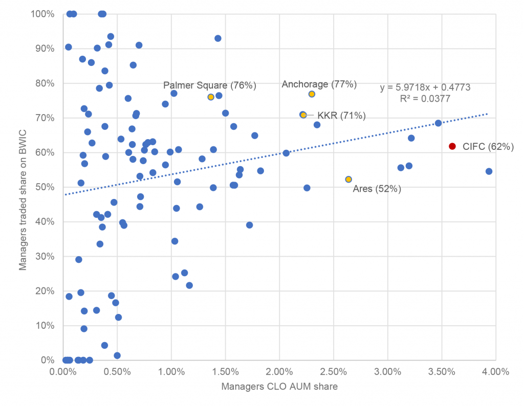 Note: A manager’s BWIC traded share is the percentage of traded BWIC to the total BWIC volume that is comprised of bonds from CLO deals they manage. Numbers in parentheses show the traded share of selective managers.  The dots represent 109 managers with an aggregate CLO AUM of $725.6 billion.   ‘AAA’ CLO traded BWIC volume is year-to-date through 8/19/2022.
