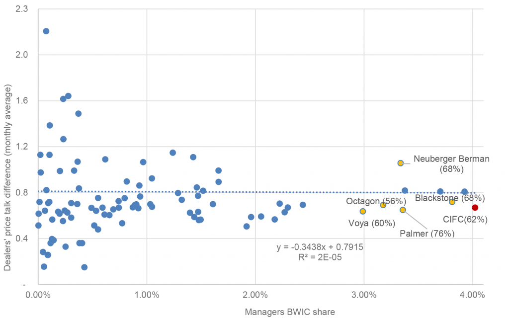 Note: Dealers’ price talk difference by managers calculates the average price talk difference for all traded AAA-rated bonds on the monthly BWIC that are from CLO deals they manage. A monthly average (Y-axis) represents the average of dealers’ price talks difference by managers from January to August.  Numbers in parentheses show the traded share of selective managers. The dots represent 109 managers with an aggregate ‘AAA’ CLO BWIC volume of $20 billion year-to-date through 8/19/2022.