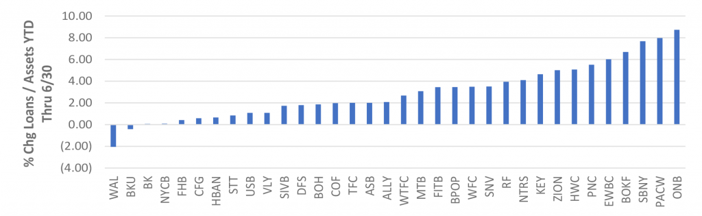 Banks in the APS tracking group had a median decline in their Tier 1 capital ratio so far this year of 60 bp (Exhibit 1). This decline is partly attributable to strong loan growth (Exhibit 2). and while loans typically carry higher yields and drive stronger earnings, they also usually require additional capital. Banks have also taken record losses in their available-for-sale securities portfolios, which have flowed through accumulated other comprehensive income to hit capital, too. While most banks are able to ignore these hits for their T1 capital calculation, the banks’ tangible capital is still affected. Also, our tracking group includes a couple of Global Systemically Important Banks which are not allowed to ignore these AOCI adjustments in their T1 calculations, and those banks reflect T1 adjustments larger than the median.