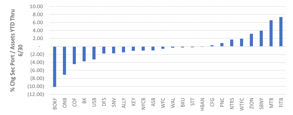 Even for banks that saw net reductions in the size of their securities portfolios, many of them were still growing the size of their 0% risk-weight buckets (Exhibit 5), either on a relative or an absolute basis. Exhibit 5 below shows several banks with declines in their total securities portfolios, but less of a decline or even an increase in their 0% risk-weight Treasury portfolios.
