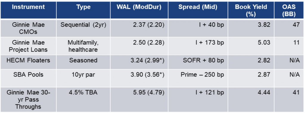 Banks have many 0% risk-weight options available to them, and often opt for Ginnie Mae securities as they can provide roughly a 50 bps yield advantage to treasuries. Below is a menu of those options (Exhibit 6), which include Ginnie Mae CMOs, HECM floaters, SBA pools, Ginnie Mae project loans, and Ginnie 30-year pass-throughs.