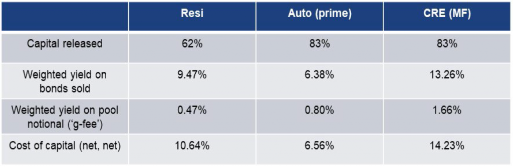 For banks that would prefer not to issue traditional forms of capital for various reasons such as shareholder dilution or cost, another strategic solution that banks are exploring is a credit-linked note structure. CLNs are sometimes referred to as ‘denominator trades’, in that they improve capital ratios by reducing risk-weighted assets (the denominator in bank capital ratios). These structures can free up 60 – 85% of the capital that a bank holds against a specific loan portfolio (Exhibit 7). Depending upon how well the particular loans lend themselves to securitization, the bank may be able to achieve a favorable CLN capital structure. Market spreads also play a key role in determining the cost of such a transaction. APS recently refreshed cost of capital estimates for auto, residential mortgage and commercial mortgage loans.