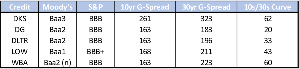 Dick’s Sporting Goods remains the widest trading credit in the ‘BBB’ retail space excluding department stores, despite having margin and credit profiles similar to or better than peers. Recent quarterly results beat consensus estimates, prompting management to raise full year-guidance. Furthermore, net sales and EBIT levels are considerably higher than pre-pandemic levels. Bonds issued in January of this year are now trading at a deep discount and have the steepest 10s/30s curve in the peer group, providing for an attractive entry point.