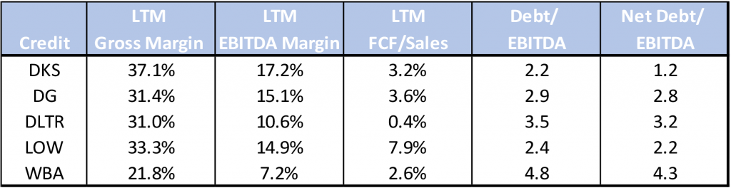 In June, DKS entered into an agreement to exchange $100 million of its convertible senior notes due in 2025 for cash. Concomitantly, DKS unwound the corresponding portion of the convertible note hedge and warrants for 1.7 million shares of the company’s common stock. Given DKS’ strong cash position which stood at $1.9 billion at the end of the fiscal second quarter, the rating agencies tend to view leverage from a net perspective. That said, the exchange will have a minimal impact to its current leverage ratio. However, the use of both cash and equity for the exchange was viewed positively by agencies and S&P noted that it highlights management’s conservative financial policies.