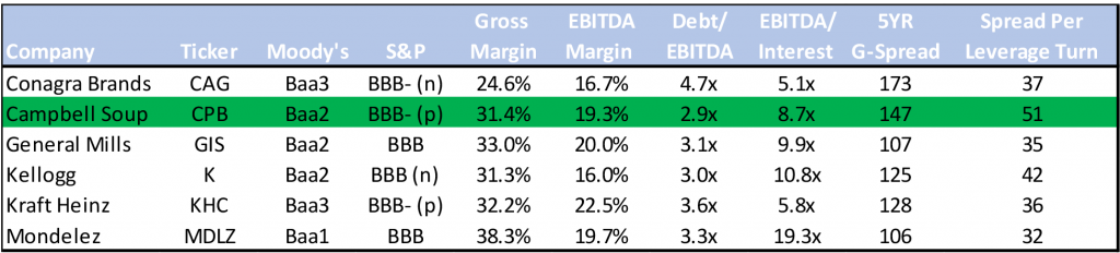 Our analysis highlights Campbell Soup (CPB) as it provides the most spread per turn of leverage in the 5-year part of the curve (Exhibit 1).