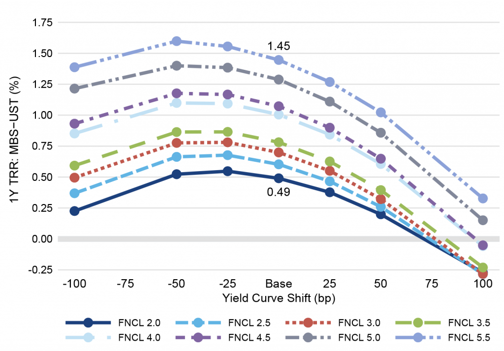 In a base case where rates show no change over one year, 30-year pass-throughs easily beat portfolios of 2- and 10-year Treasury debt matched to the duration of each MBS. The order and magnitude of outperformance mirror the different spreads in each pass-through. At the low end, 30-year 2.0% pass-throughs show projected 1-year returns 49 bp higher than Treasury debt, and, at the high end, 30-year 5.5% pass-throughs show returns 145 bp higher (Exhibit 1).