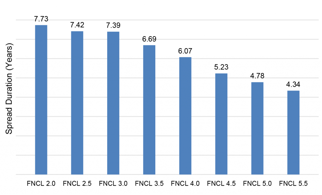 Investors have to weigh material differences in spread risk across 30-year pass-throughs. Sensitivity to changing MBS spreads varies from 7.40 years in 30-year 2.0%s to 4.54 years in 5.5%s. MBS spreads at current levels look more likely to tighten than not, but investors need to be ready to tolerate spread volatility.