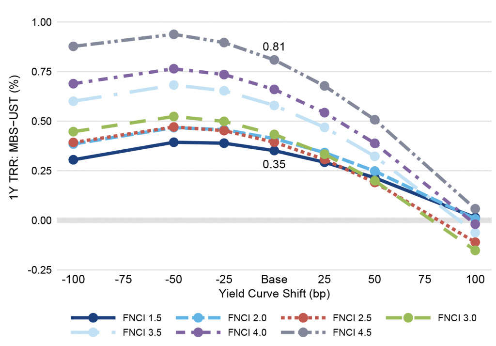 Most pass-throughs hold their return advantage over shifts up or down in the yield curve of as much as 100 bp. Coupons 2.0% through 4.5% do underperform if rates shift higher by 100 bp. But coupons 5.0% and 5.5% continue to outperform through higher rates, the 5.5% coupon by a projected 33 bp.