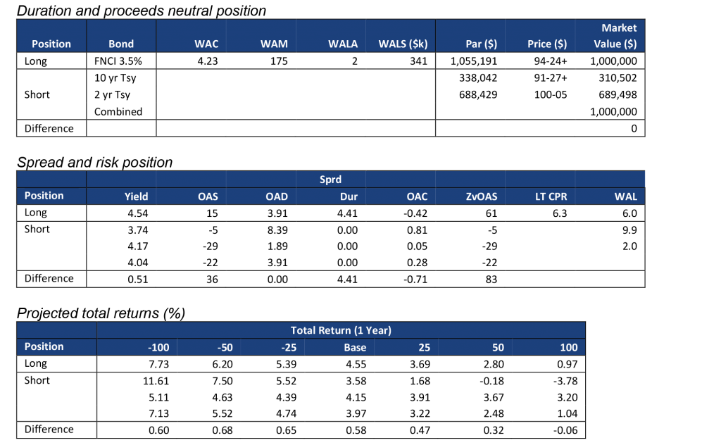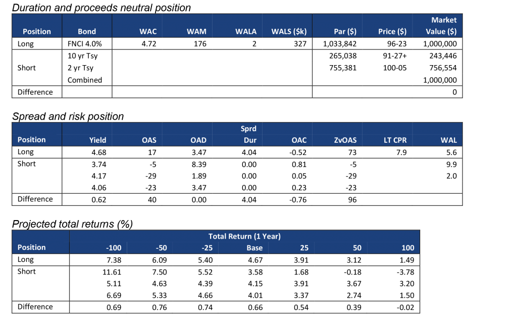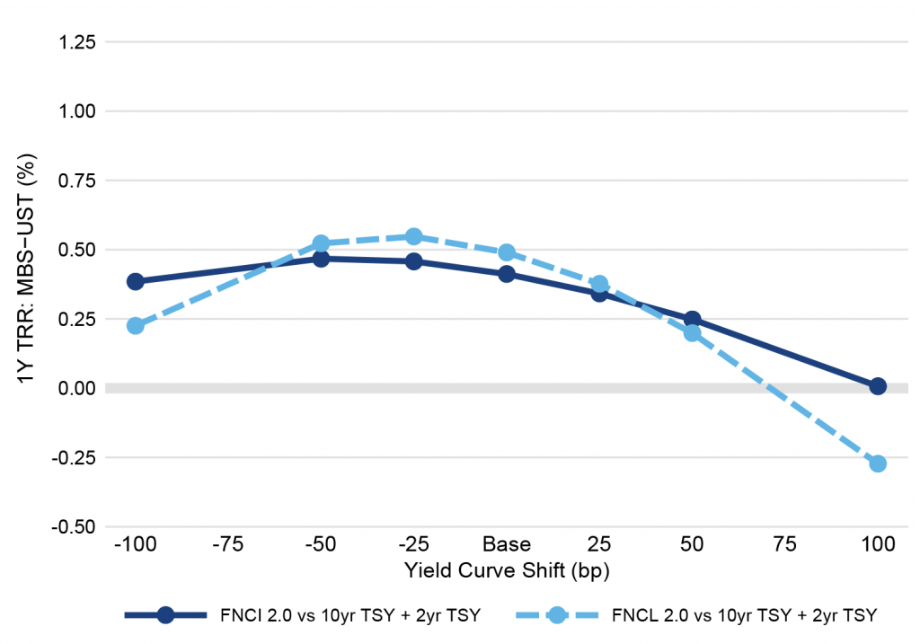 At lower coupons, 15-year MBS offer a comparable return profile to 30-year MBS. For example, hedged total returns of FNCI 2.0%s underperform hedged total returns of FNCL 2.0%s at the base case and in small rate moves, but outperform in larger moves (Exhibit 4). However, 15-year pass-throughs have less exposure to the spread between mortgage and Treasury yields. That is an advantage for investors that worry about more spread widening but do not want to overweight higher coupons.