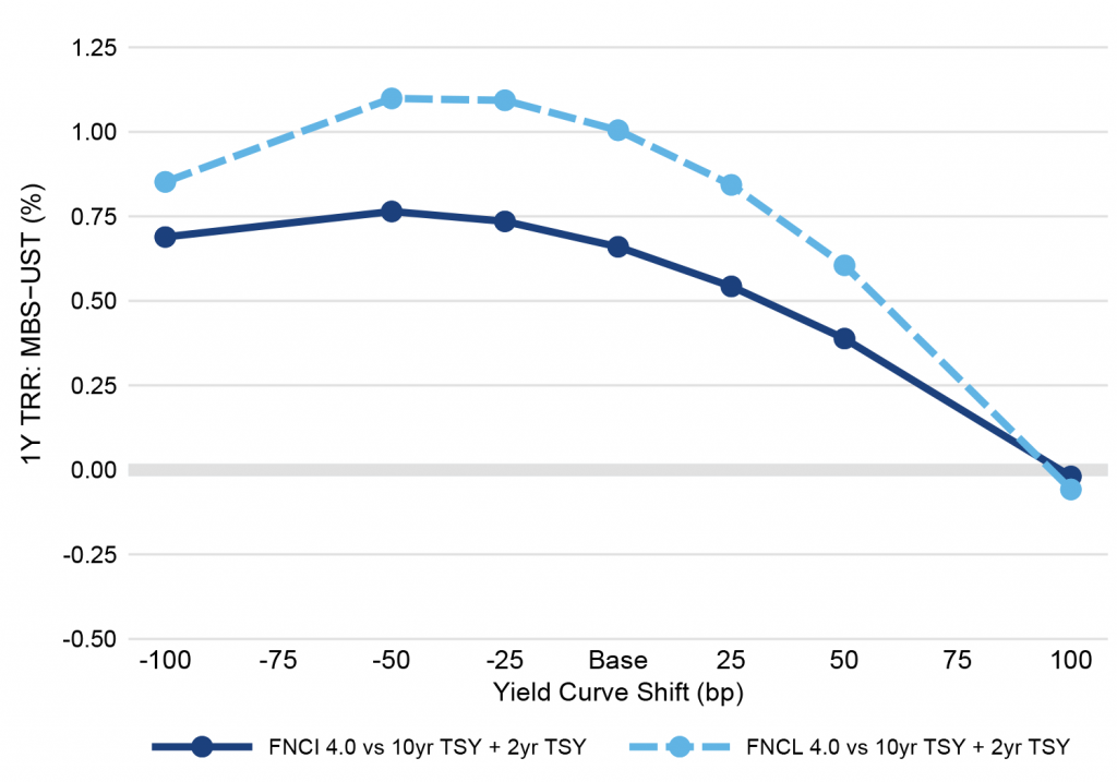 A pattern of returns where MBS performance against Treasury debt peaks in a base case and then fades in the wings is typical. Price performance in negatively convex MBS is worse than performance in positively convex Treasury debt as rates shift. And big shifts in rates eventually offset the MBS spread and income advantage. The only difference currently is the strong initial outperformance of MBS and its ability to survive bigger shifts in rates.