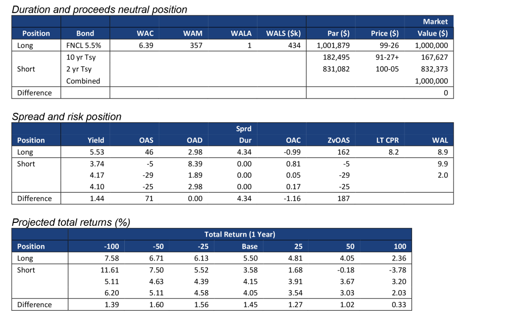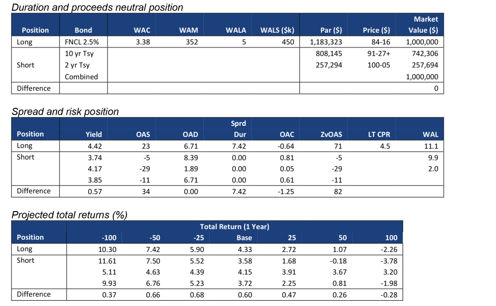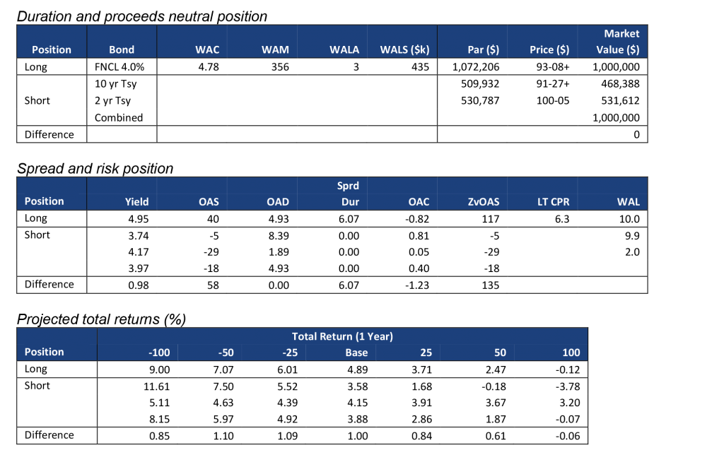 Note: Data shows the performance in 15-year TBA MBS net of returns in a duration- and proceeds-matched portfolio of 2- and 10-year Treasury notes. All market levels as of COB 9/29/22. Total returns in all assets assume a linear parallel shift in rates and constant OAS repricing at horizon, reinvestment in 1-month SOFR. Returns do not account for dollar rolls. Calculation details in the appendix to this note.