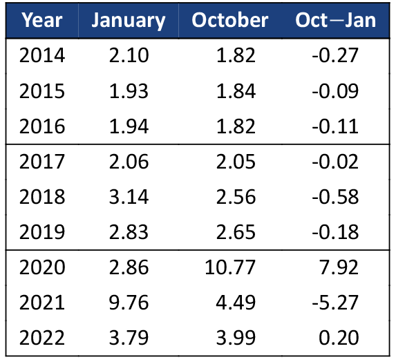 FHA delinquencies follow a seasonal pattern, falling in the spring and then ramping up throughout the year, so some increase is expected. However, the October level is typically lower than the January level (Exhibit 2). The only exception in nine years was due to the Covid-19 pandemic that started in 2020