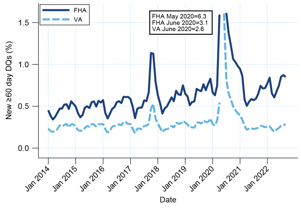 The rate of new 60-day delinquencies is at the highest level in the nine years Ginnie Mae has been publishing loan-level data, with two exceptions (Exhibit 2). The first exception came with the 2017 hurricane season, which affected many FHA borrowers in Puerto Rico, among other locations. The second exception was at the start of the pandemic in 2020. Notably, VA loans are not showing a similar uptick in new delinquencies; the pace is a little lower than before the pandemic.