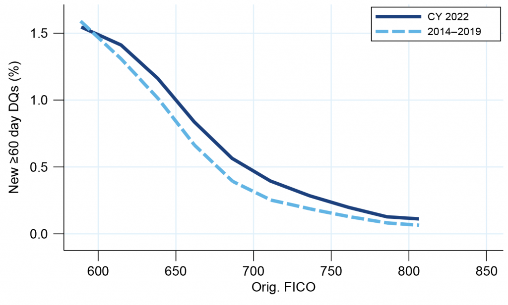 The pickup in new defaults is occurring for borrowers across the spectrum of credit scores (Exhibit 4). The largest pickup occurs for borrowers with credit scores between 650 and 700, but even borrowers with scores over 800 are defaulting faster than before the pandemic. One reason might be due to credit score inflation during the pandemic. Many pandemic relief policies suspended delinquency reporting to credit bureaus, which caused many borrowers’ credit scores to increase. Therefore, the score might not represent the true risk of those borrowers.