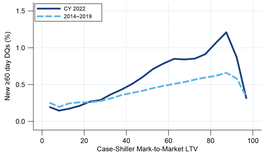 Borrowers with higher loan-to-value ratios also tended to default faster compared to before the pandemic (Exhibit 5). Only borrowers with extremely low or high LTVs had similar default rates compared to times before the pandemic. Most borrowers with high mark-to-market LTVs have new loans and haven’t had as much time to get into financial difficulties.