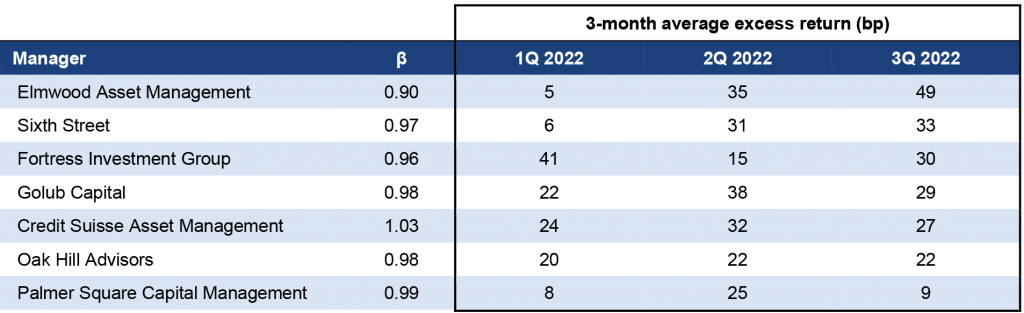 Note: The data shows the average excess return relative to the Morningstar/LSTA Total Return Index for 82 managers with five or more active deals. The data cover performance for the three-monthly reporting periods ending on or before September 20, 2022.