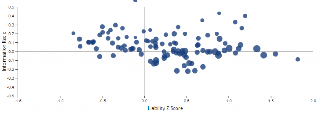 The excess return posted by individual managers ranged from 56 bp at the high end to -106 bp at the low end. Of the 82 managers tracked, 35 or 43% outperformed the index during the quarter and most of them were low beta managers. On a weighted average basis, low beta managers delivered a 14 bp excess return to the index through September.