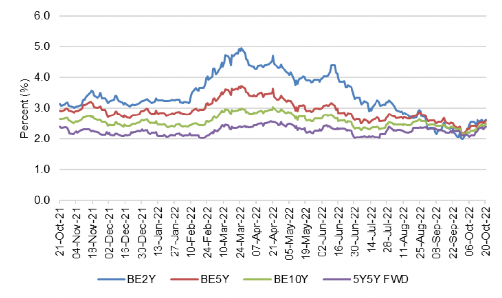 OIS forward rates now imply fed funds will peak around 4.85% early next year and hold through September 2023. That is roughly consistent with the September FOMC dots. But broad inflation, stoked by shelter and medical costs and tight labor, could make the Fed’s fight harder. There is still risk of repricing the Fed path.