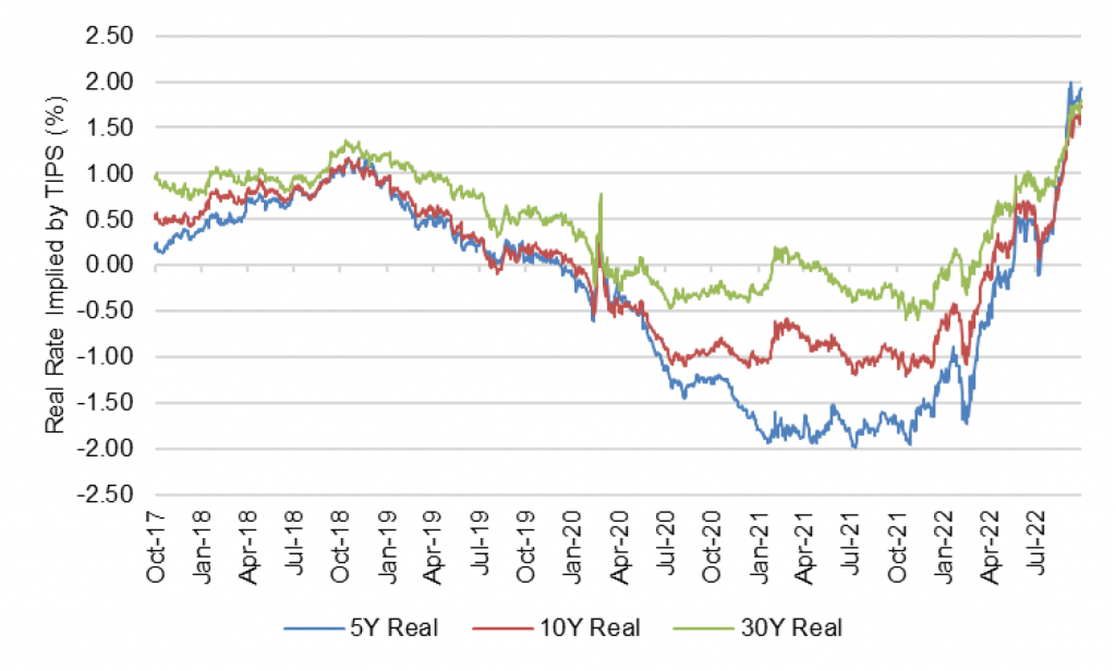 - Expected real rates. Long rates should also cover the expected real cost of money—the rate in the long run that clears money supply and demand. The current 5-year forward 5-year real rate is 1.7%, well above most estimates of the long-run US real rate of interest. Real rates across the curve are high, too (Exhibit 2). Unfortunately, the real rate does not get posted in the markets every day. It is only inferred. But the Fed’s current estimate of neutral fed funds is one benchmark, and that now stands at 2.5%, only 50 bp higher than the Fed’s 2.0% estimate of long-term inflation. That implies a neutral rate of 0.5%. Other approaches to estimating real rates also pin the US real rate since 2010 somewhere between 0.5% and 1.0%. Current real rates look as if the market expects the Fed to tighten financial conditions and keep them there for the next decade. If anything in the rates market is fundamentally mispriced, longer real rates are it.