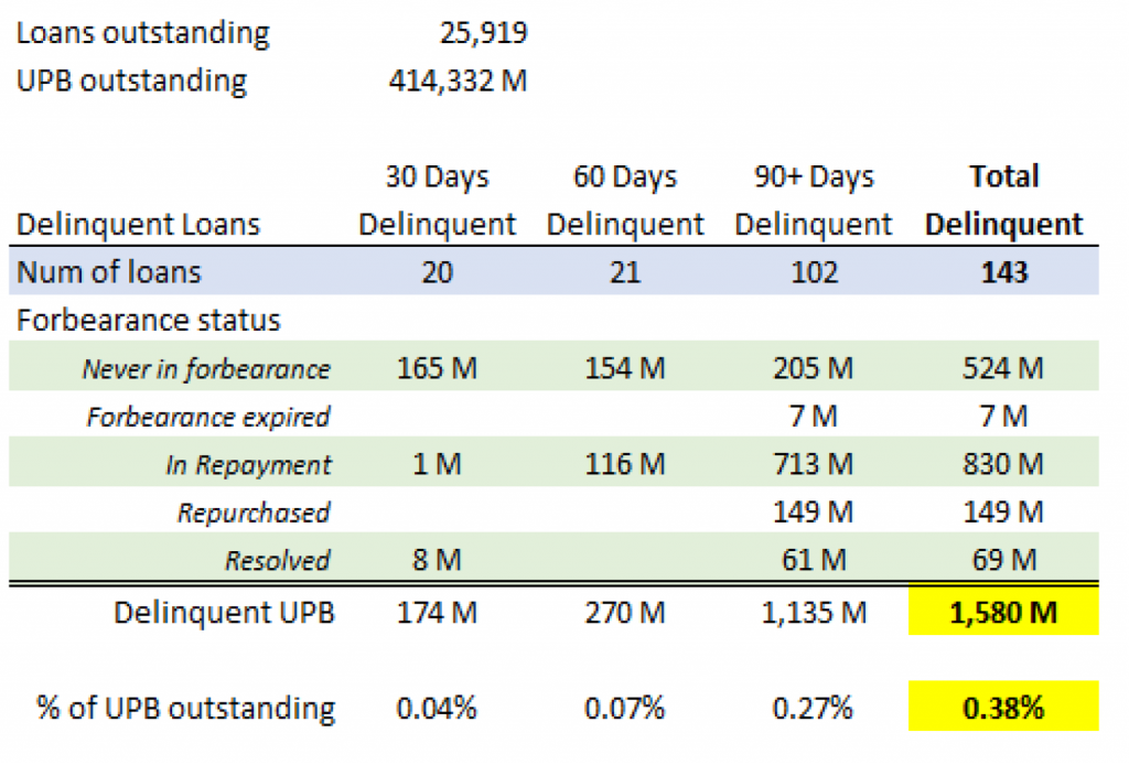 Some portion of the loans in repayment, $830 million or 0.20% of the outstanding principal balance, will likely ultimately default and enter workout. Worst case scenario might assume all 143 loans comprising 0.38% of outstanding and currently delinquent UPB ultimately default. Compared to the historical default rates and losses primarily incurred due to the financial crisis, those incremental defaults would be rather modest. Assuming a historical loss severity of 31%, that 38 bp of defaults would generate 12 bp of losses. That’s less than the cumulative losses from the 2009 vintage alone, which was the best performing vintage of the first decade of the 2000s. The overall performance of Fannie Mae’s portfolio has been quite strong (Exhibit 3). The pandemic crisis in agency multifamily looks like it has been largely resolved and contained.