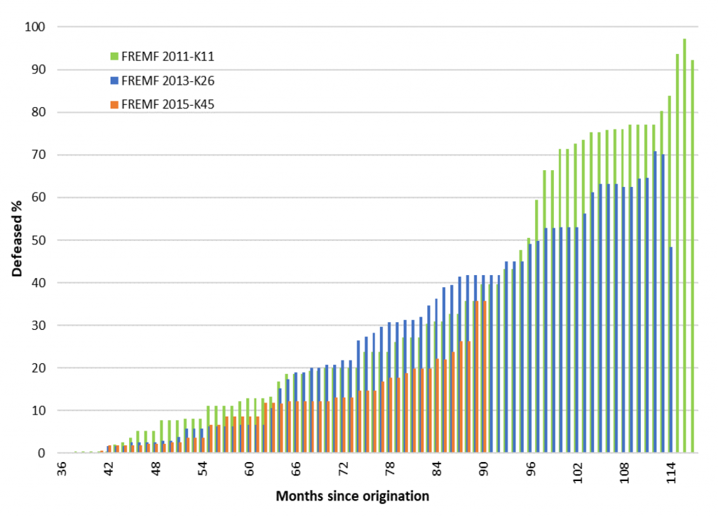 Borrowers should be in no hurry to refinance at considerably higher interest rates, so prepayment speeds during the open period should slow and the maturity of the bond extend. The open period when Freddie K fixed-rate borrowers can prepay their loans without defeasance or penalties varies. Loans in current deals tend to have 4- or 7-month open periods. And current deals almost uniformly require defeasance. Earlier vintage deals more commonly included yield maintenance or prepayment penalties and have somewhat more flexible open periods.