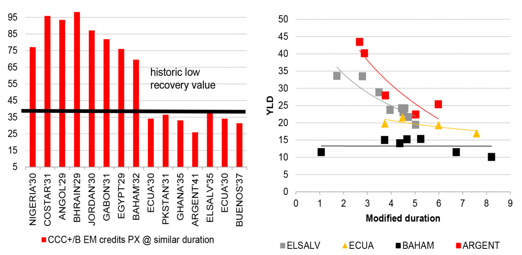 There are several credits that trade at their percentage-of-par claim on recovery value. The sub-40 bond prices for Argentina, the Province of Buenos Aires, Ecuador, and El Salvador imply imminent default with low recovery value (Exhibit 2). But this is where there is potential for positive surprise. There are credits like El Salvador that could pay for longer, or other credits that could even avoid default, such as the Province of Buenos Aires. And historically low bond prices also could also encourage countries to buy back debt, with El Salvador taking the lead and Ecuador soon to follow.