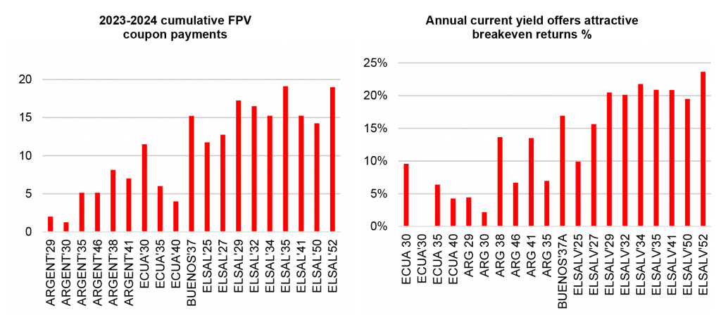 Exhibit 3: El Salvador and Province Buenos Aires offer high coupons for attractive breakeven returns