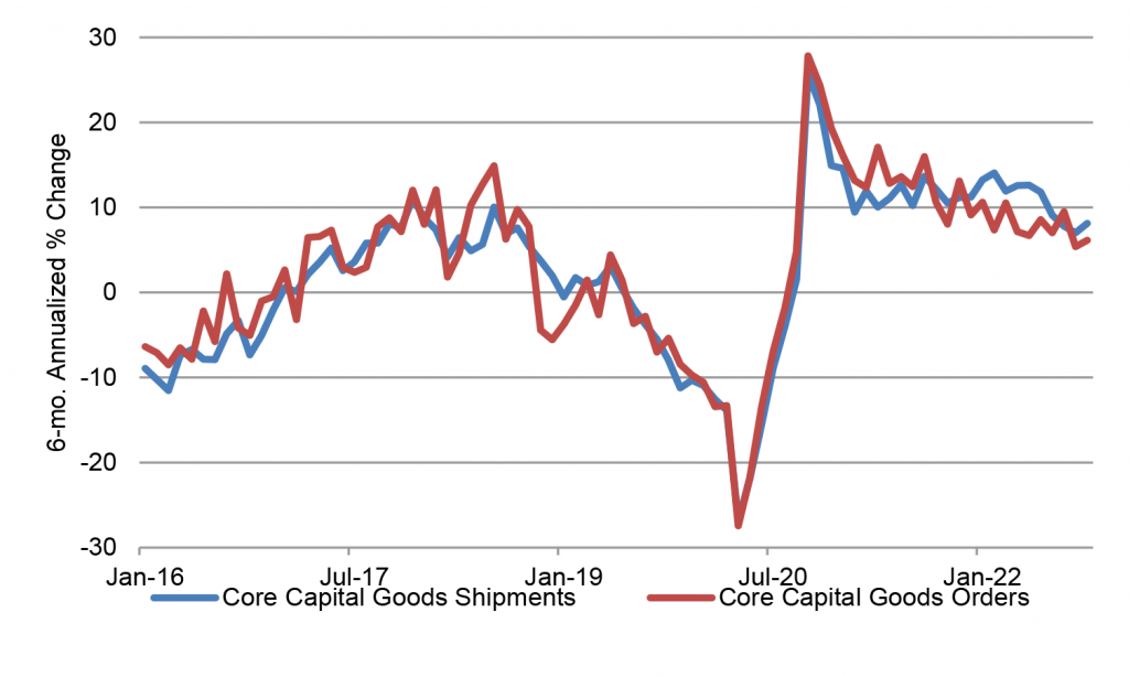 These data tends to be notoriously volatile from month to month, so a moving average tends to provide a more accurate read (Exhibit 2). While the pace of advance for each has decelerated somewhat this year, the gains are still impressive. The shipments measure increased at better than an 8% annualized clip in the six months through October, a solid result even after accounting for elevated inflation.