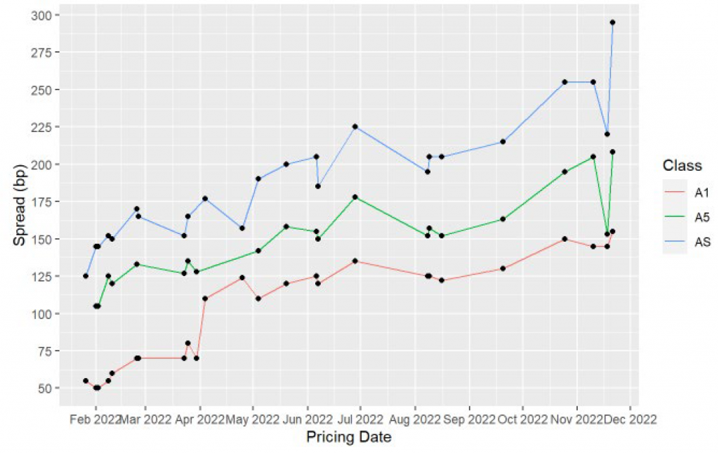 Market volatility, fears of a recession and a steeply inverted yield curve steepened the slope of the credit curve. The difference in credit spread between the A1 and E class at the beginning of the year was about 300 bp (Exhibit 3). At the recent wides in early November, the slope had increased to 675 bp, even for a strong, regular issuer.