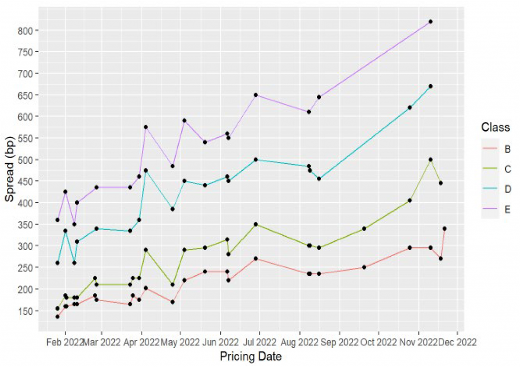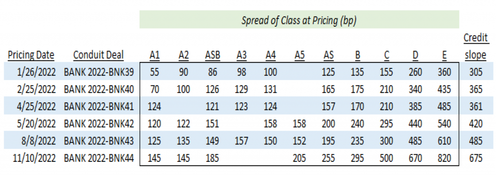 Note: Class ratings range from AA to BBB- at pricing. Spreads are to the SOFR swaps curve (P curve) except for the most recent deal shown. The BBCMS 2022-C18, which priced on 11/18/2022, was benchmarked to the Treasury curve and the A-/A rated C class was the lowest rated class sold.