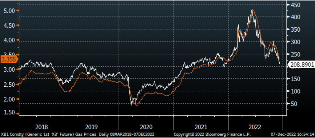 Gasoline futures tend to lead retail pump prices by about a month or so. Futures prices have continued to slide in recent days. While this partly reflects the normal seasonal pattern, the ongoing fall suggests that pump prices may continue to decline heading into 2023. The historical relationship between the current gasoline futures contract and the AAA regular unleaded price tends to be tight (Exhibit 2). The futures price as of December 8 points to retail gasoline prices sinking by another 25 to 30 cents over the next month or two, perhaps approaching $3 a gallon, a level not seen since the spring of 2021.