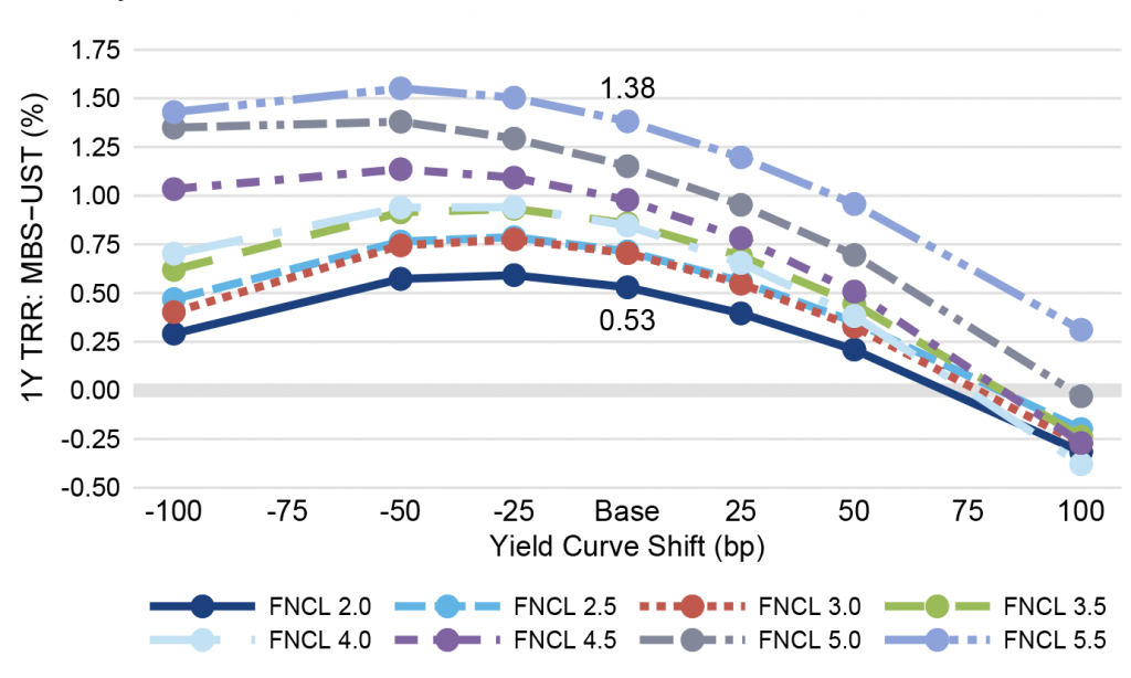 A pattern of returns where MBS performance against Treasury debt peaks in a base case and then fades in the wings is typical. Price performance in negatively convex MBS is worse than performance in positively convex Treasury debt as rates shift. And big shifts in rates eventually offset the MBS spread and income advantage. The only difference currently is the strong initial outperformance of MBS and its ability to survive bigger shifts in rates. The pass-throughs outperform Treasuries unless interest rates increase at least 75 bp.