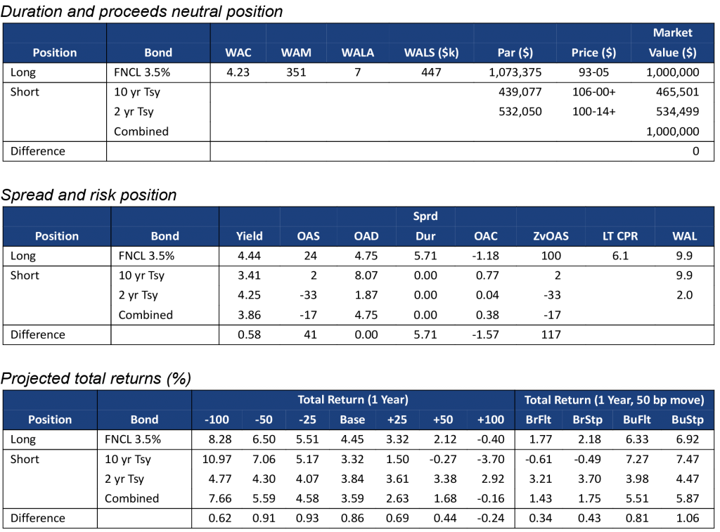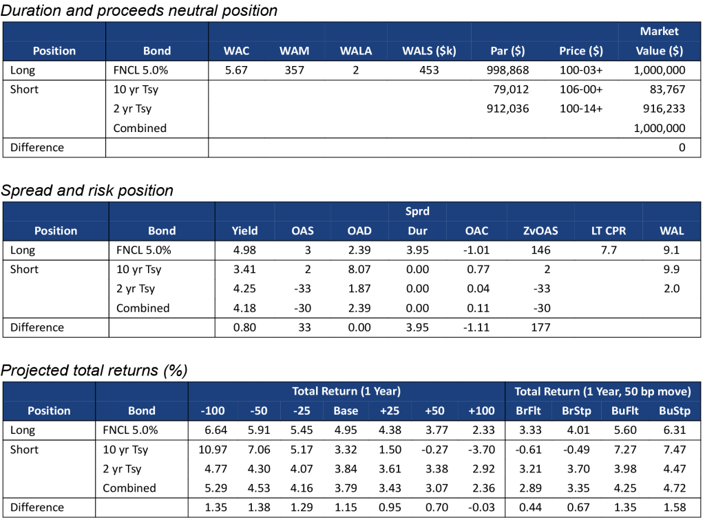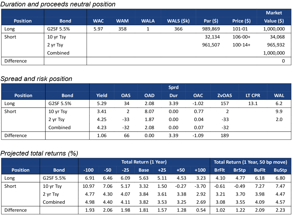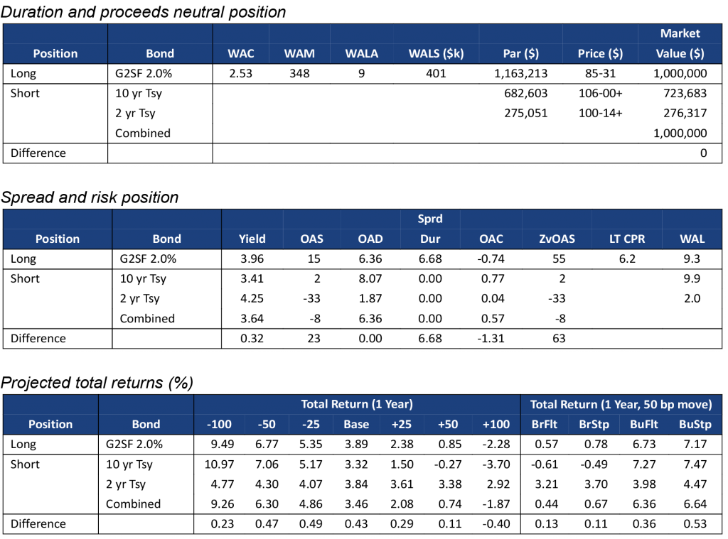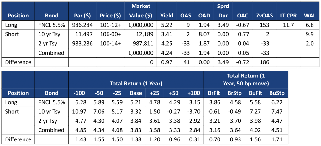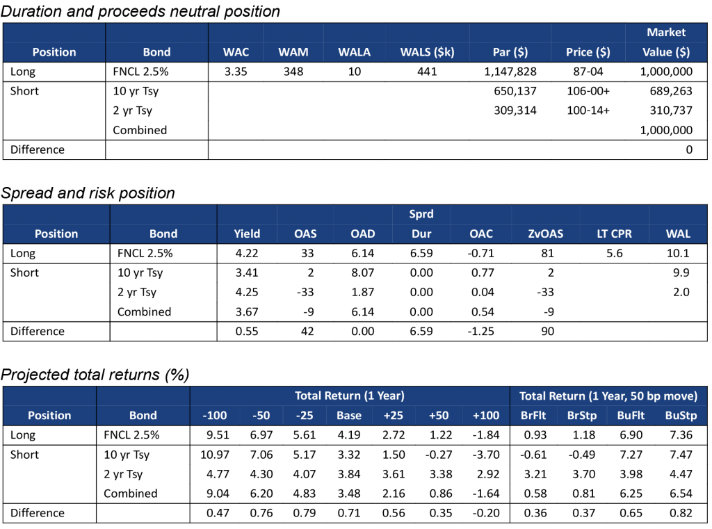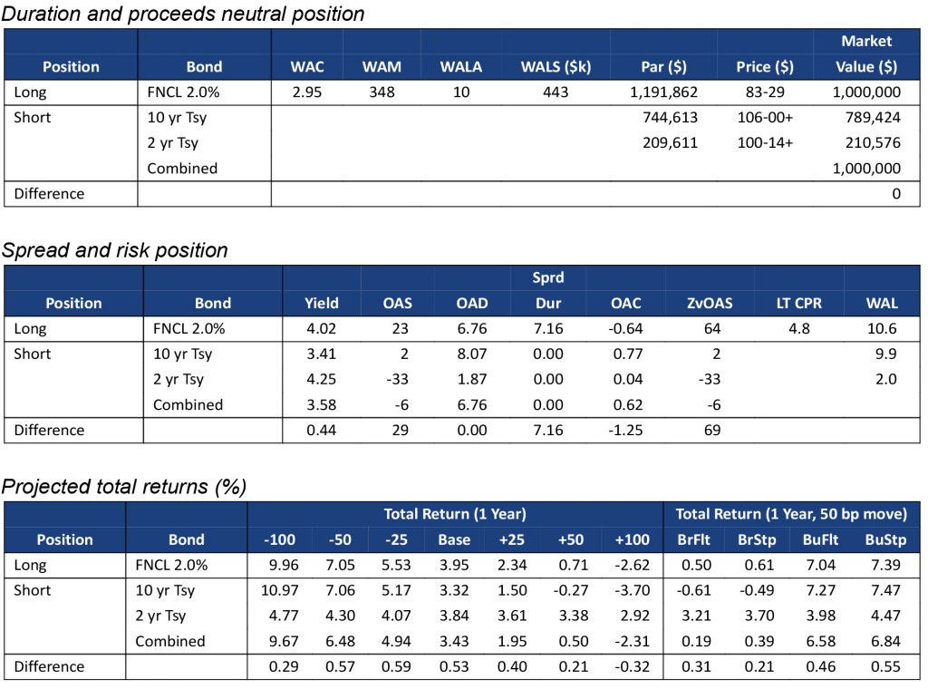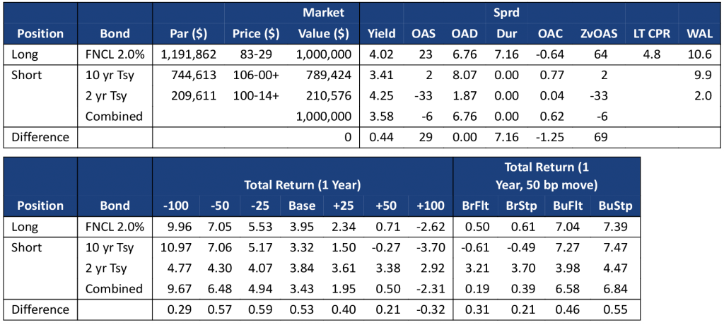 Although Yield Book’s model assigns similar convexities to FNCL 2.0%s and FNCL 5.5%s, the lower coupon MBS has substantially larger convexity gap with its matching Treasury portfolio than the higher coupon MBS. This is because the lower coupon MBS has a longer duration, and its matching Treasury portfolio is heavily weighted towards the more convex 10-year Treasury bond (Exhibit 2a). The 2.0% pass-through has a convexity of -0.64, but that becomes -1.25 after hedging with 2-year and 10-year Treasuries. The FNCL 5.5% is a shorter duration security and more comparable to the 2-year Treasury (Exhibit 2b). Its convexity is -0.67, but only drops to -0.72 after hedging.