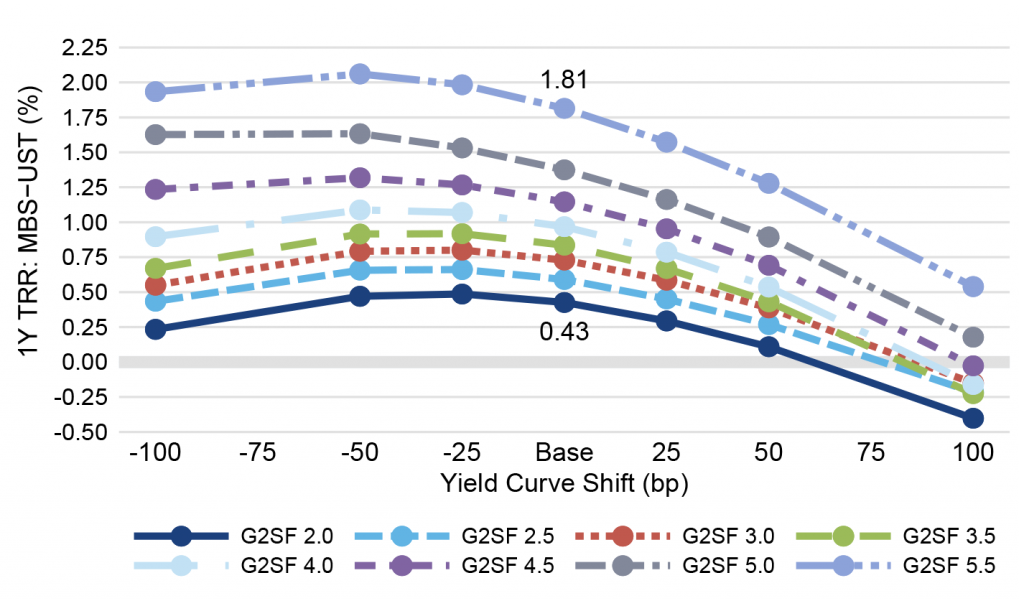 Investors may be able to enhance returns at higher coupons using Ginnie Mae MBS instead of conventional MBS (Exhibit 3a). For example, the G2SF 5.5% security returns 1.81% in the base case net of Treasury returns, while the conventional MBS is only projected to return 1.38%.