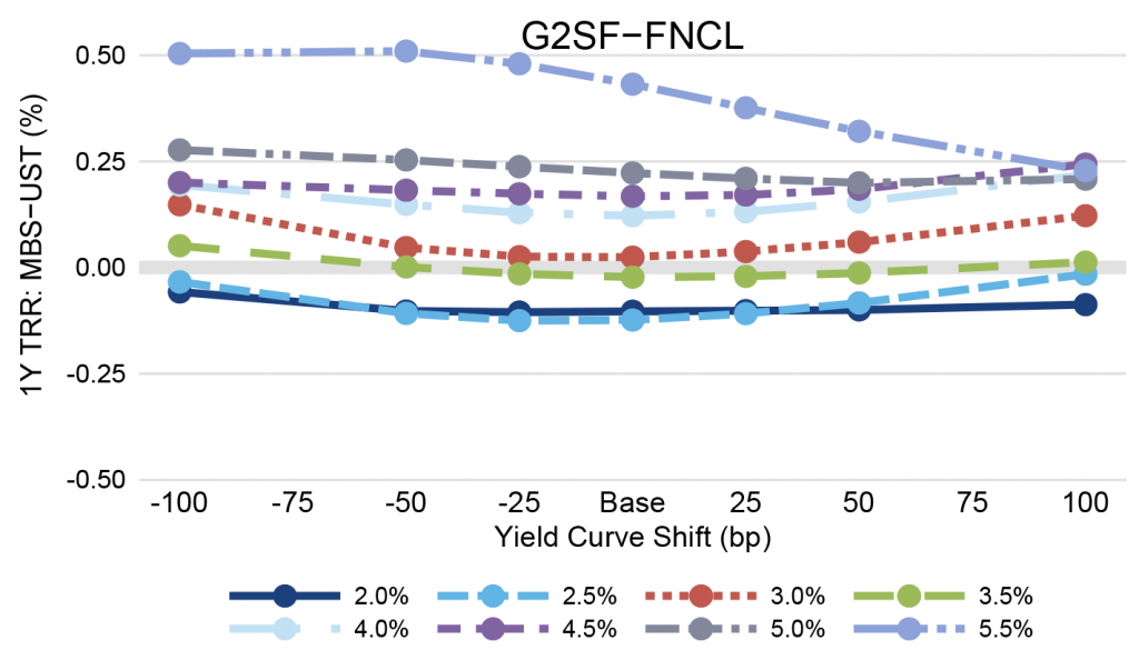 Many of the Ginnie Mae securities, after hedging for duration, are slightly more convex than their conventional counterparts. Only the G2SF 5.5% is less convex than conventional MBS, but it offers the most outperformance across all but the highest interest rate scenario. This coupon is most exposed to refinance risk should mortgage rates continue to fall, because VA loans typically refinance faster than other loan types. It also appears likely that the FHA will lower mortgage insurance premiums sometime next year, which would boost prepayment speeds. That would lower returns on mortgage-backed securities priced above par. However, the FHA is likely to make only a modest reduction to premiums so the effect on value will be muted compared to the premium reduction in 2015.