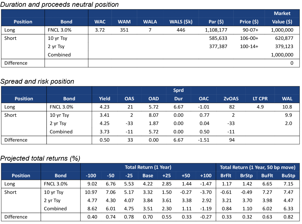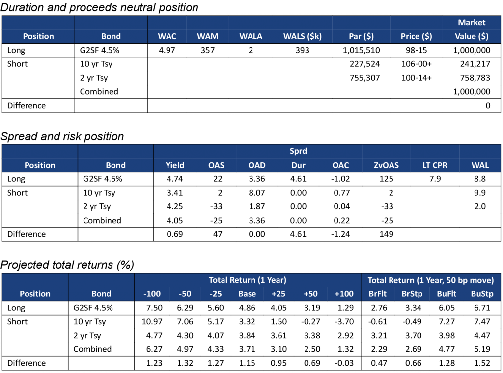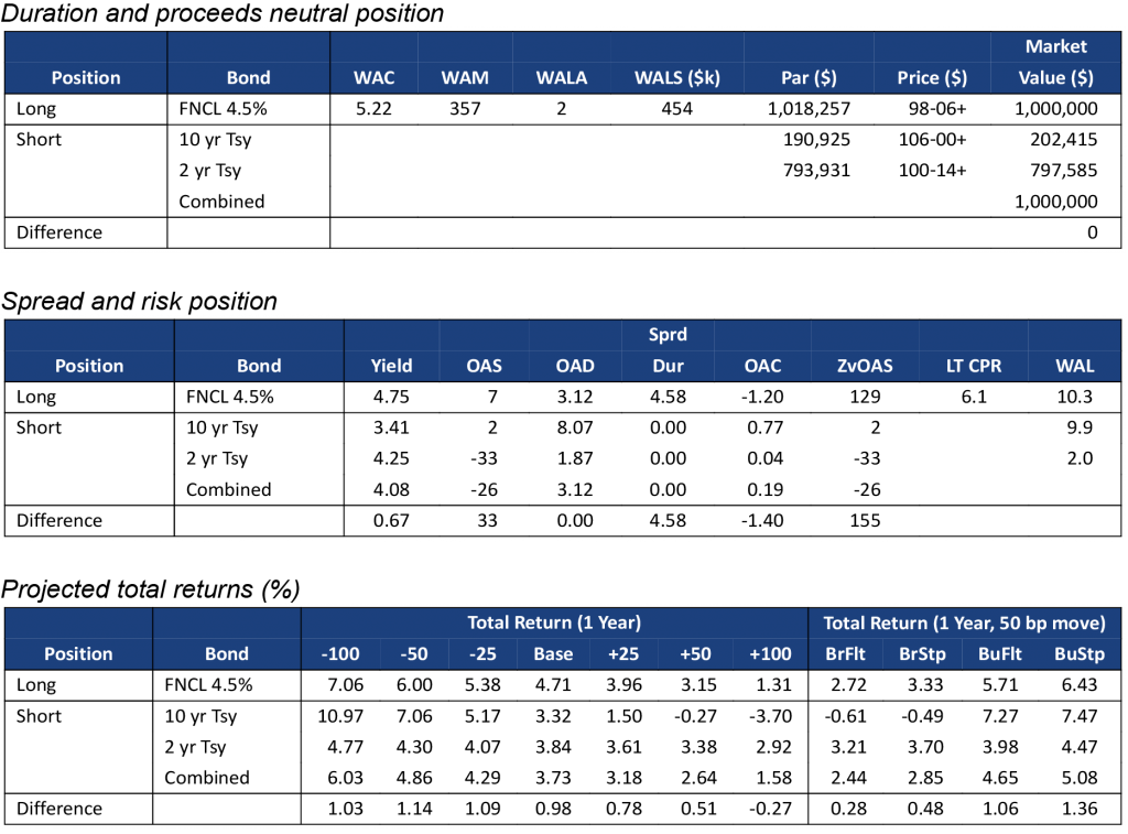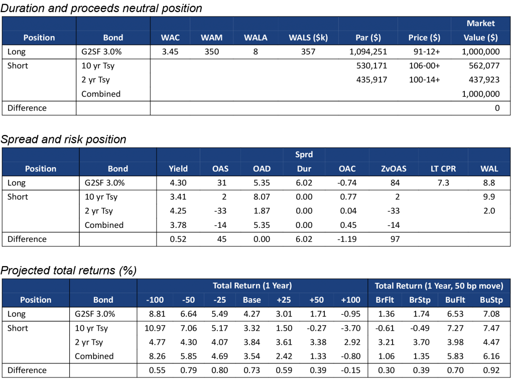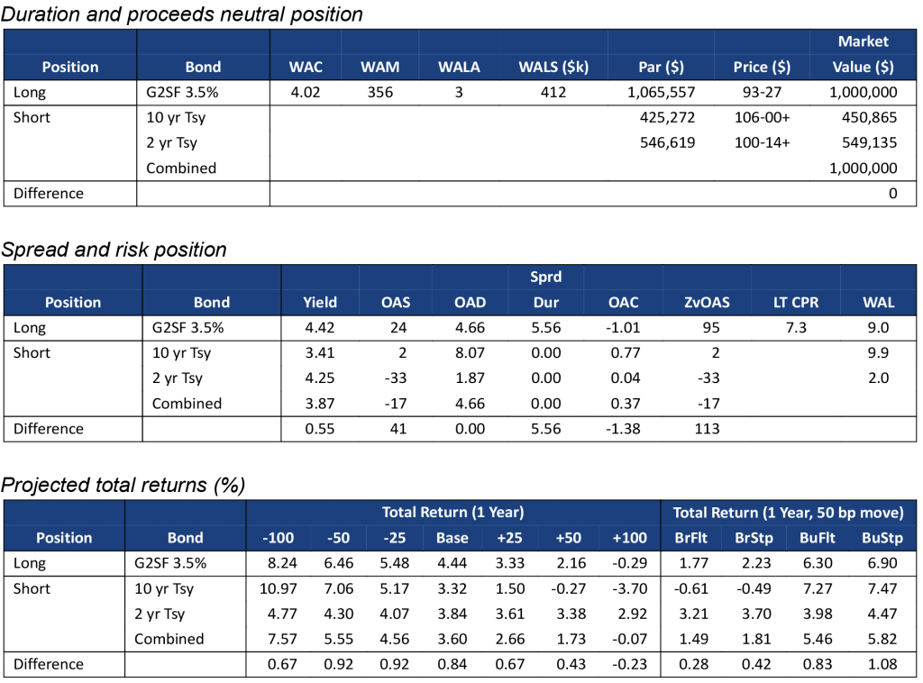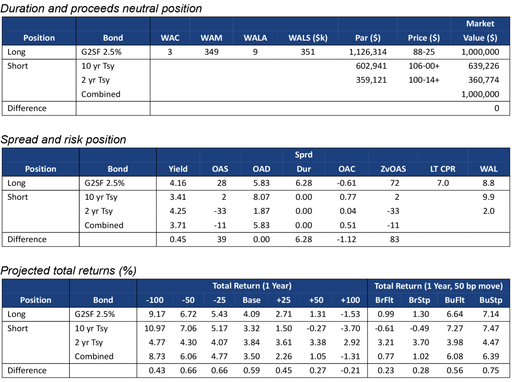 Note: Data shows the performance in 30-year TBA MBS net of returns in a duration- and proceeds-matched portfolio of 2- and 10-year Treasury notes. All market levels as of COB 12/7/2022. Total returns in all assets assume a linear parallel shift in rates and constant OAS repricing at horizon, reinvestment in 1-month SOFR. Returns do not account for dollar rolls. Calculation details in the appendix to this note.