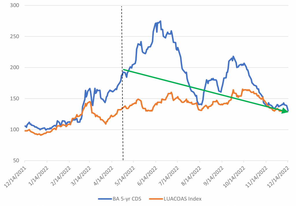 At the end of April, following extremely weak first quarter results, I suggested that Boeing (BA: Baa2/BBB-/BBB-) might finally be seeing the light the at the end of the tunnel, and might be on a clearer path to operating recovery for bondholders. At the time, management took several charges that were one-time in nature, but kept guidance intact to reach positive operating cash flow for the full fiscal year of 2022. BA has been among the higher beta credit performers in investment grade industrials throughout the year. Spreads initially moved considerably wider following the first quarter earnings report and hit a peak near the third week of June with 5-year CDS spreads topping out at 275. And while BA spreads also gapped out with the broader market in the fall, all told the 5-year CDS level moved from 193 at the end of April, to 129 in the second week of December, vastly outperforming the industrial sector and the broader IG market.