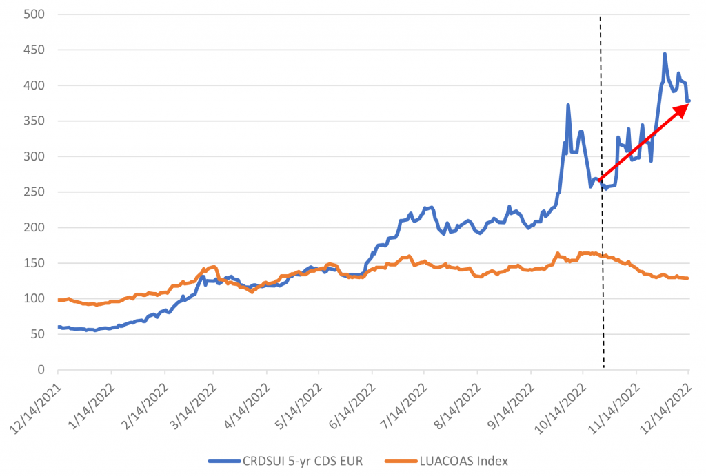 While CS management has made progress on these plans, including the official launch of its rights offering last week to raise a total of $4.3 billion, doubts still loom about the longer-term prospects of the bank, and spread levels continue to reflect a tremendous amount of uncertainty. Furthermore, in a November preview of fourth quarter earnings, CS management projected a substantial loss for the quarter. Perhaps more concerning was news that deposits, and net asset outflows have abated a bit since peaks in October but had yet to fully reverse course. As a result, CS used liquidity buffers in order to bolster regulatory ratios. More recently, CS saw a moderate stock recovery on comments from management that the outflows may be finally coming to an end, but it has been a rocky ride since our initial report several weeks earlier, nonetheless.