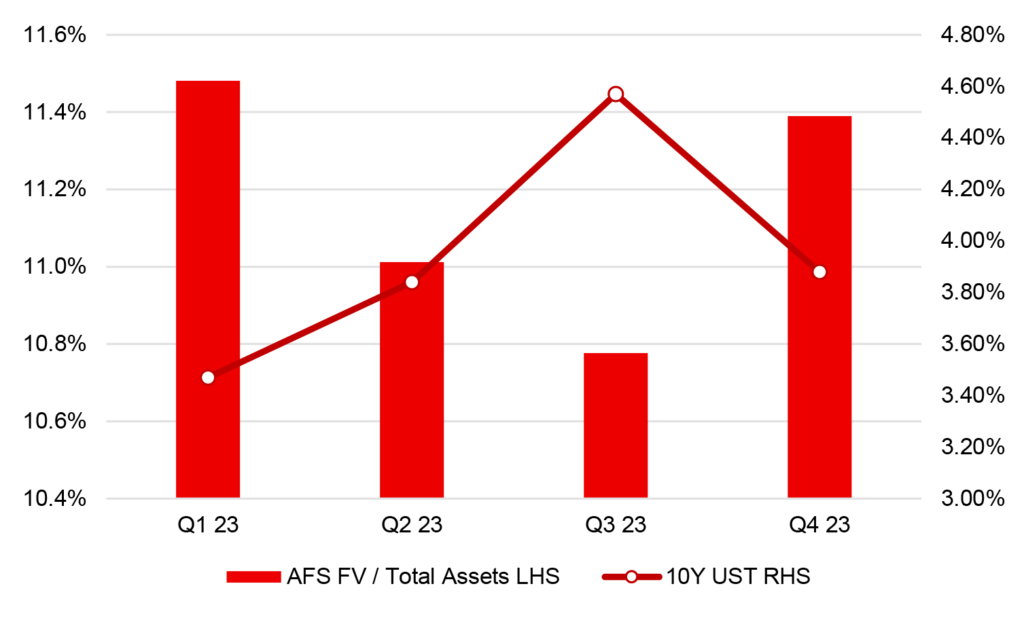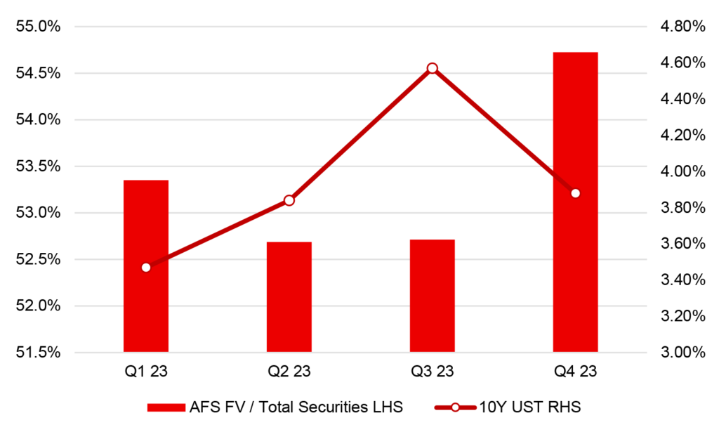 Fluctuations in AFS securities market value, largely driven by changes in interest rates, will affect the mix of AFS and HTM since banks carry HTM securities at amortized cost and do not mark-to-market (Exhibit 3). This pattern is evident when looking at the change from the first quarter of 2023 to the second quarter, when the market sold off and AFS allocation declined. Similarly, much of the increase in AFS allocation from the third quarter to the fourth quarter can be explained by the market rally. It is interesting that with a large market sell-off in the third quarter of 2023, the AFS allocation remained constant from the end of the second quarter, where it could have been expected to decline. This could be explained by banks over-allocating new purchases to AFS in the third quarter following the bank failures in the first half of the year, which highlighted the priority for liquidity.