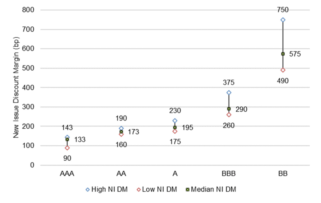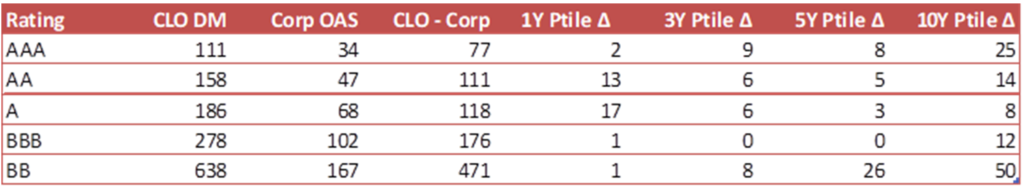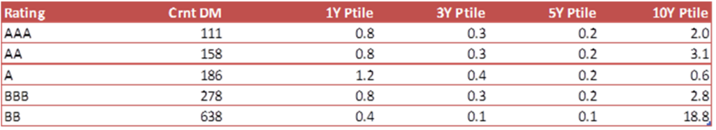 Most rating classes trade tight to corporate debt based on the last 3Y of spreads, with ‘AA’ and ‘A’ slightly wider than others using 1Y spreads