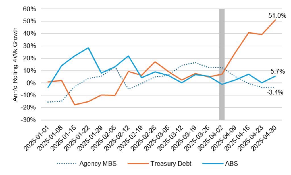 Moody’s downgrade of the US could push credit spreads out slightly, but that should quickly take a back seat to developments in tariffs. The de-escalation by the US and China a week ago has taken significant risk out of the market by showing China’s willingness to talk and possibly compromise. There is still significant risk of escalation with other trading counterparties, but China is a big one. That explains the tightening in risk spreads in the last week. The Bloomberg US investment grade corporate bond index OAS traded on Friday at 90 bp, tighter by 9 bp in the last week. Nominal par 30-year MBS spreads to the blend of 5- and 10-year Treasury yields traded Friday at 149 bp, tighter by 3 bp in the last week. Par 30-year MBS TOAS closed Friday at 34 bp, wider by 1 bp in the last week.