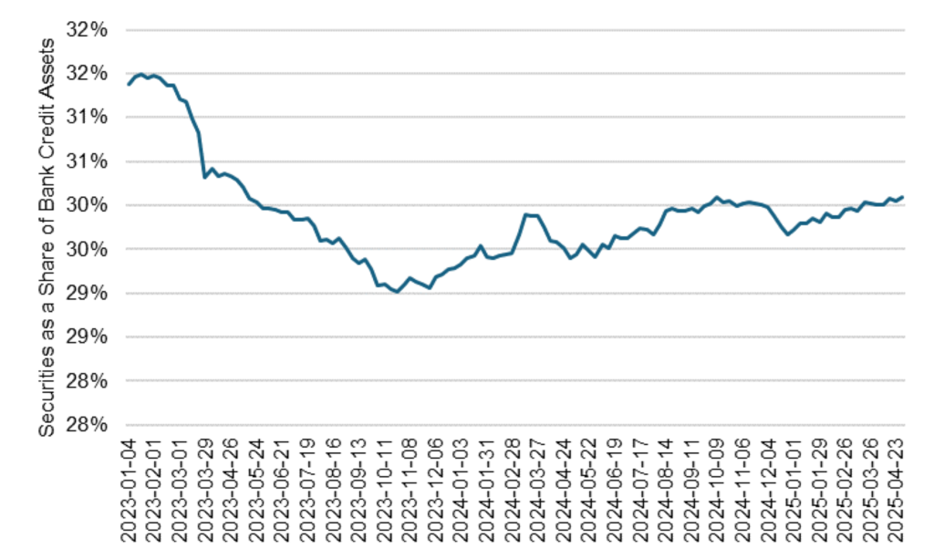 In general, securities continued to grow through April as a share of banks’ credit book—securities and loans. Securities’ share has been rising since late 2023, rebounding from an earlier drop after a combination of higher interest rates and the negative convexity of MBS left significant unrealized losses on the balance sheet (Exhibit 3). Through hedging of assets such as agency CMBS and purchases of capped floating-rate CMOs, banks have rebuilt some of their positions.