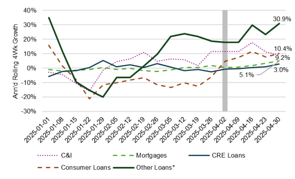 It is hard to know what prompted the faster growth in lending to private debt portfolios and to consumers. Many companies anecdotally have suspended major investments and presumably would not need new debt. But it is possible after the April 9 pause in tariffs that some corporate and individual borrowers decided to accelerate purchases of imported goods and needed credit for the purchases.
